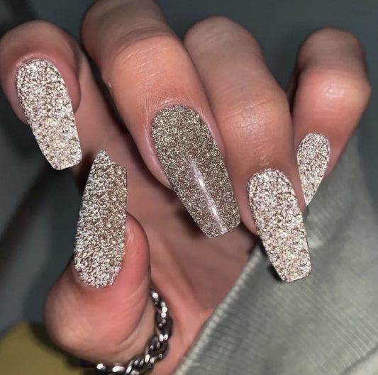 Valentine's Romance Medium Coffin Black and Beige Press On Nails with Heart Accents and Glitter Detail