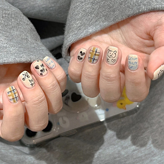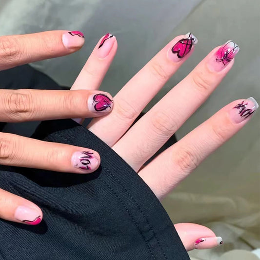 Sweetheart Romance Medium Square-Shaped Multicolor Press On Nail Set with Glitter Accents and Heart Designs