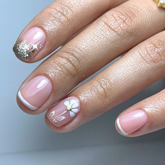 Valentine's Romance Medium Square Shape Sheer Pink Press On Nails with Heart Accents and Bead Embellishments