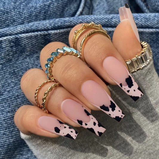 Cowhide Short Almond Black Animal Pattern Press On Nails