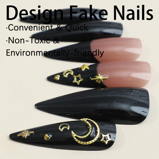 Galactic Glamour Long Stiletto Black and Beige Nail Set with Celestial Accents
