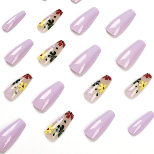 Off The Cliff Long Coffin Purple Floral Press On Nails