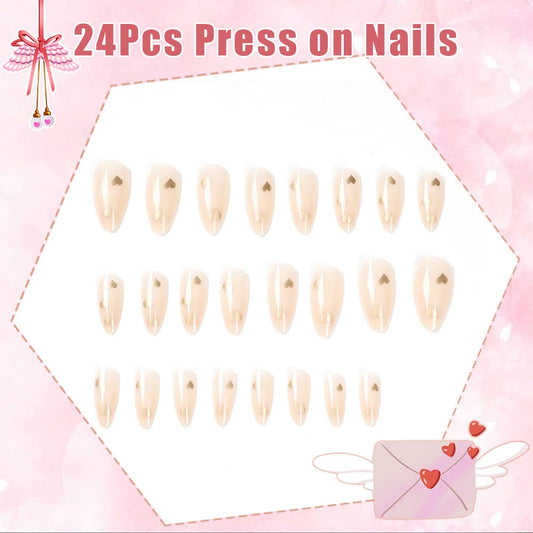 Heart Of Gold Long Oval Beige Hearts Press On Nails