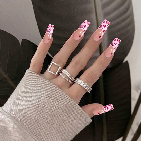 Tropical Elegance Long Square Pink Leopard and Floral Press On Nail Set with Stunning Design Details