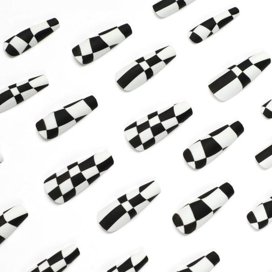 Checkered Wavy Long Square Black Groovy Press On Nails