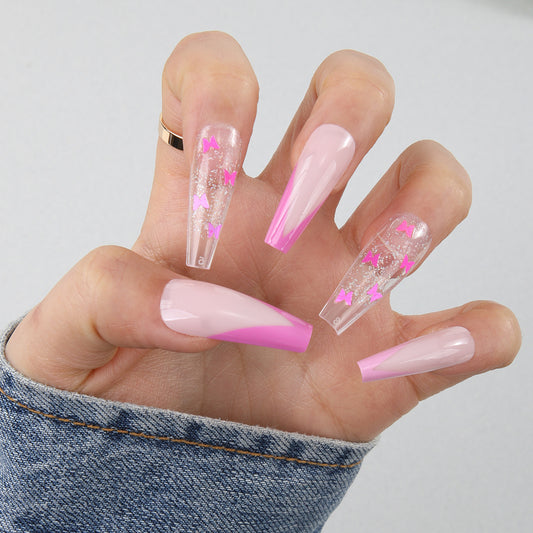 Enchanting Elegance Long Almond Shaped Translucent Pink Press On Nail Set with Glitter Finish