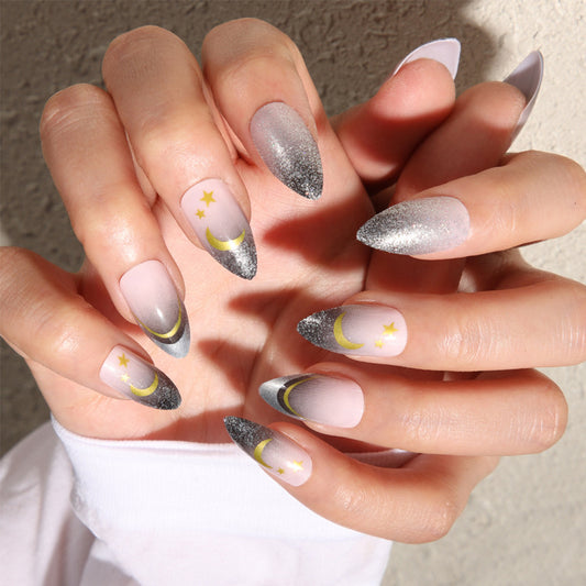 Elegant Swan Dream Medium Almond Glittering Grey Press-On Nail Set with Artistic Detailing