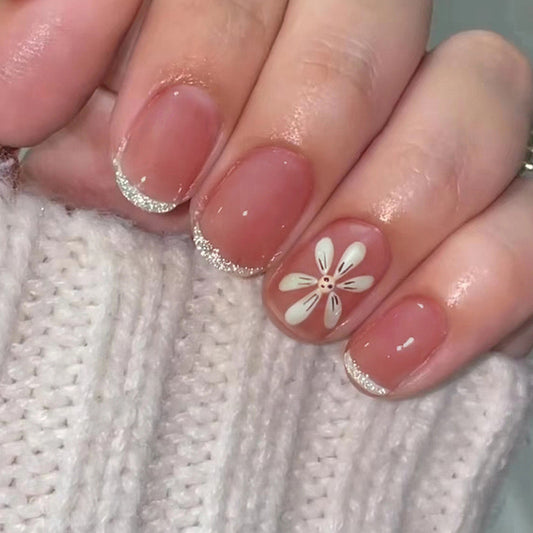 Tropical Elegance Short Square Pink Press On Nails with White Flower Accent