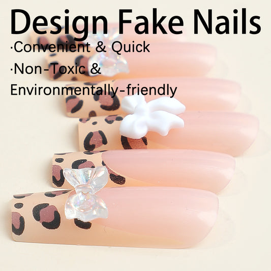 Safari Glamour Long Square Press-On Nails in Beige with Leopard Print, Crystals, and Bow Details