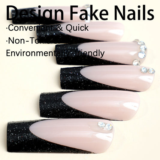 Glamorous Gala Extra Long Coffin Matte Black Press On Nails with Glitter Accents and Crystal Embellishments