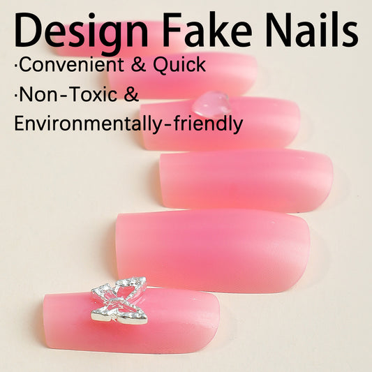 Enchanted Romance Medium Square Baby Pink Press On Nails with 3D Hearts and Butterfly Charms