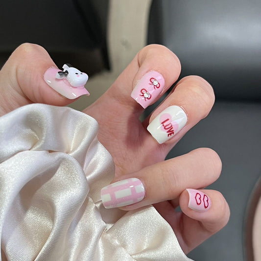 Romantic Heartfelt Pink Short Square Press On Nail Set with Adorable Heart Patterns
