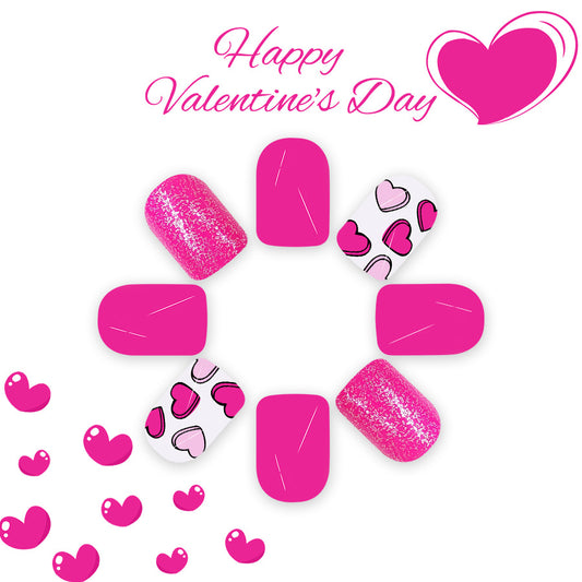 Romantic Heartfelt Pink Short Square Shaped Press On Nail Set with Glittery Heart Designs
