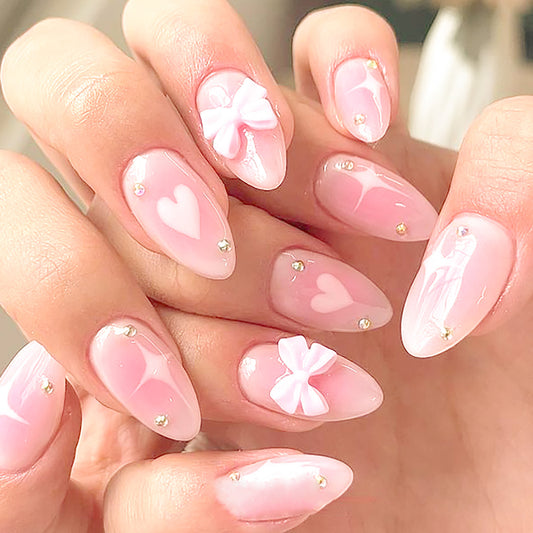 Romantic Heartfelt Elegance Short Almond Red Ombre with Cute Hearts and Bows Press-On Nail Set
