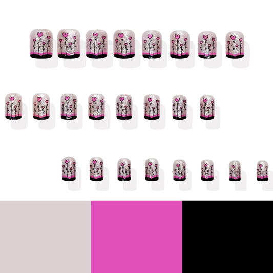 Romantic Heartfelt Kiss Press On Nail Set Short Square Light Pink and Black with Glittery Heart Accents