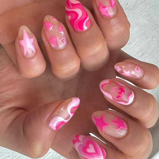 Romantic Heartfelt Dreamy Medium Round Press On Nail Set in Soft Pink with Whimsical Heart Designs