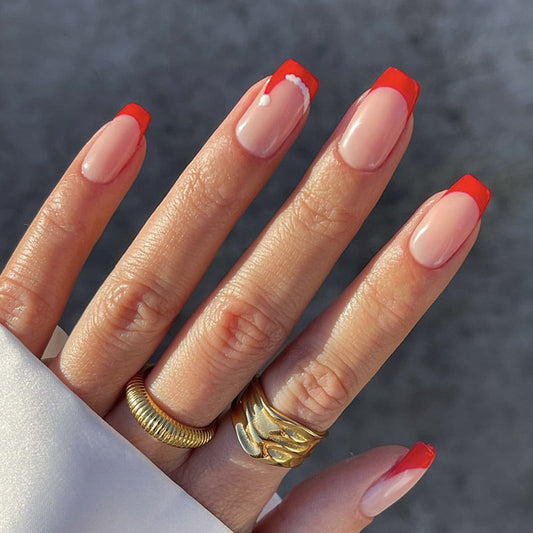 Romantic Heartfelt Glamour Short Square Red and Beige Glossy Finish Press On Nail Set