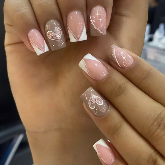 Romantic Heart Theme Short Square Shape Natural Pink Color with Heart Accents Press On Nail Set