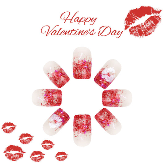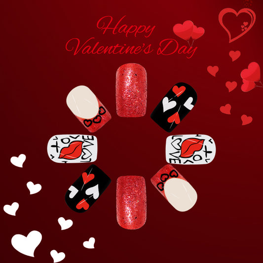 Romantic Elegance Short Square Red Press On Nail Set with Heart Art and Glitter Accents