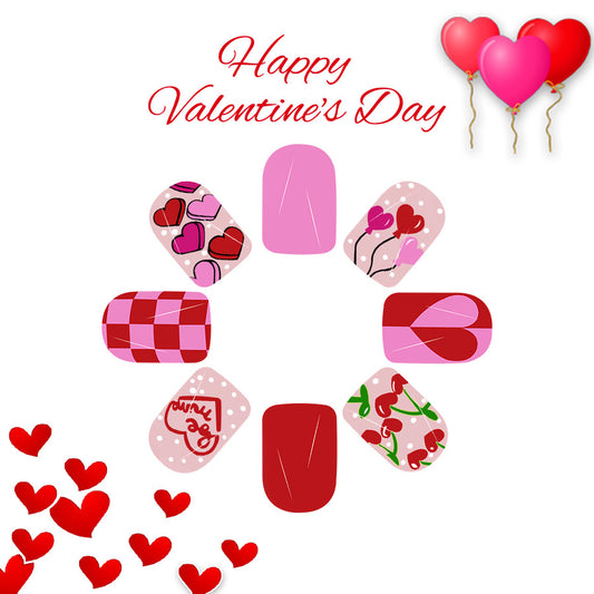 Romantic Heart-Detailed Short Oval Shaped Pink and Red Press-On Nail Set with Unique Pattern Designs for Valentine's Day