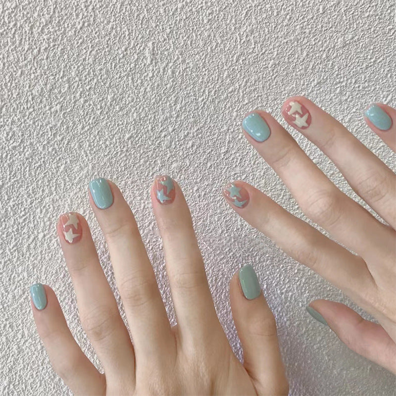 Aqua Dreamy Short Oval Shaped Press On Nail Set in Light Blue and Coral with Chic Bird Patterns
