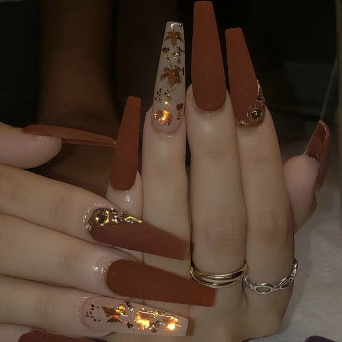 Autumn Elegance Long Coffin Terracotta Press-On Nails with Glitter Accents and Golden Flakes