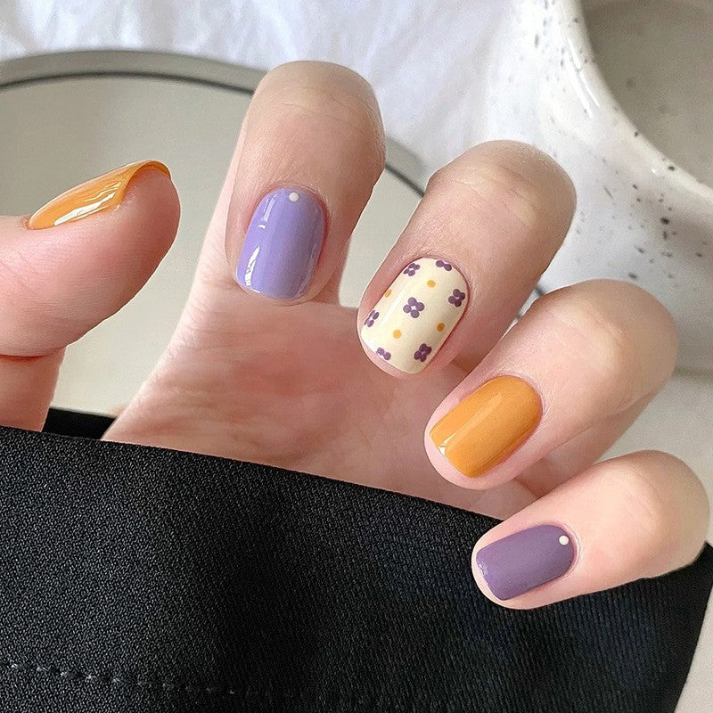 Autumn Harvest Short Squoval Lavender and Mustard Press On Nails with Floral Pattern