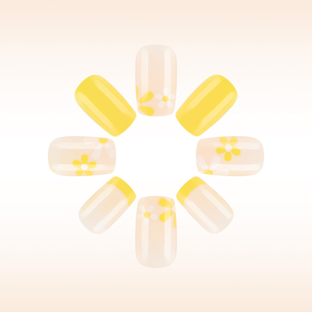 Blooming Radiance Medium Square Yellow Floral Press On Nail Set with Transparent Accents