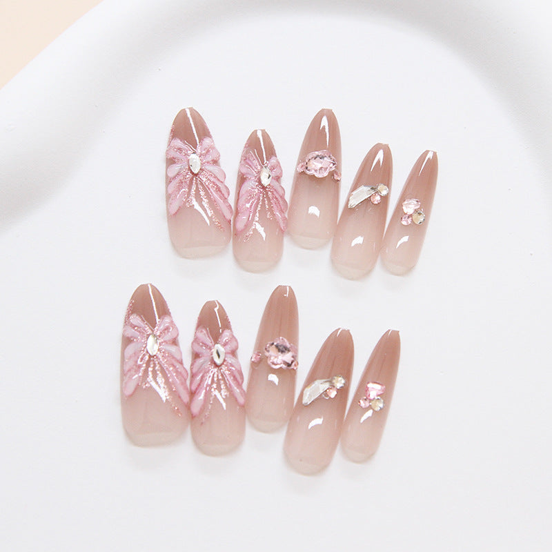 Blossom Elegance Extra Long Almond Pink Press On Nail Set with Gemstone Floral Designs