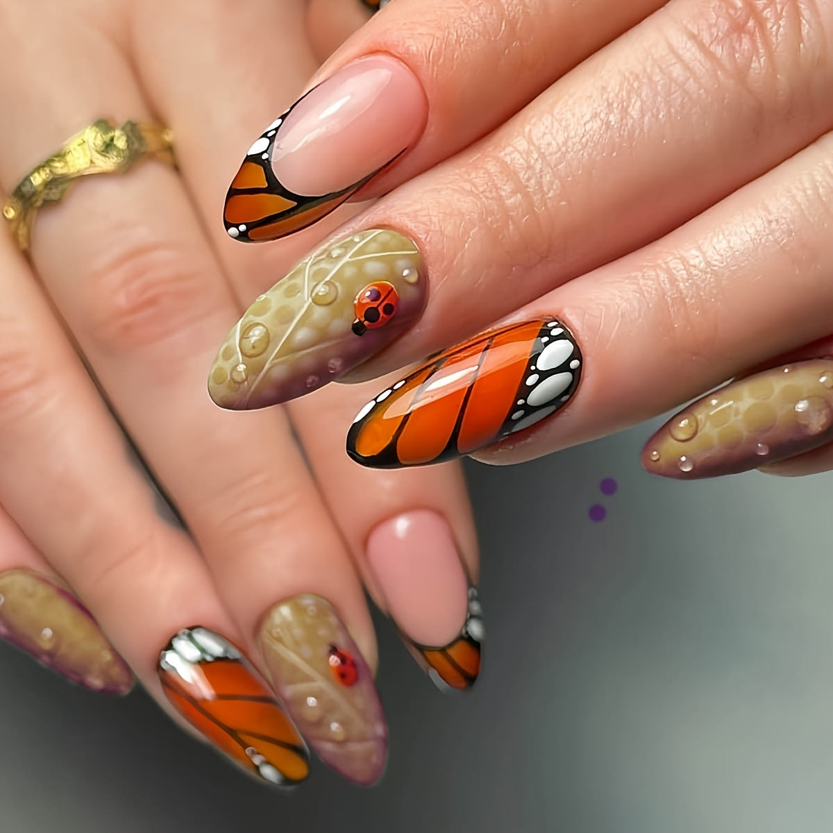 Butterfly Garden Long Almond Orange Beige Press On Nail Set with Ladybug Design
