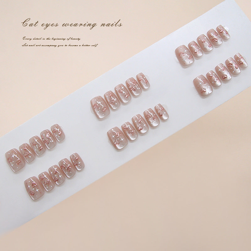 Cat Eye Charm Elegant Short Square Light Pink Nail Set with Starry Glitter Design