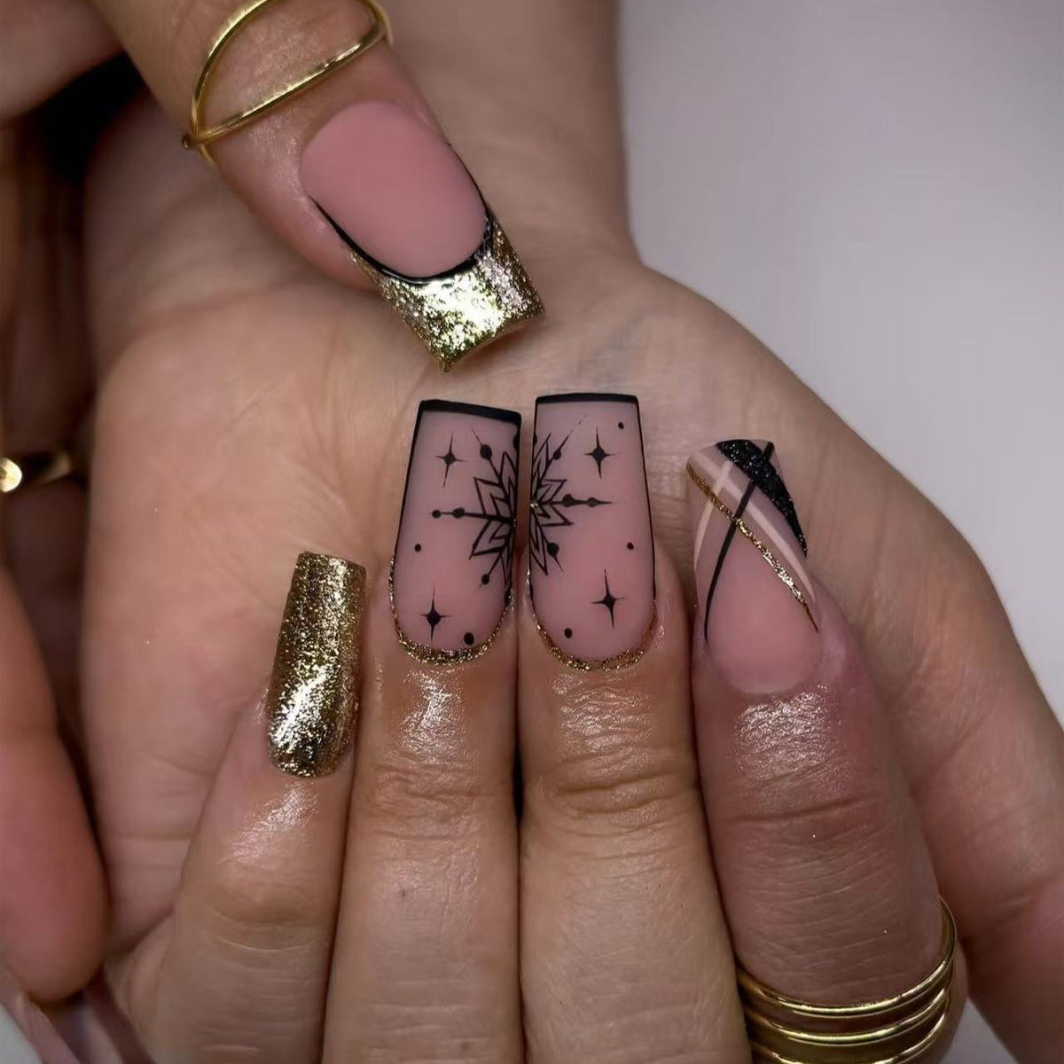 Celestial Charm Long Square Beige with Gold Glitter and Unique Starburst Design Press On Nail Set