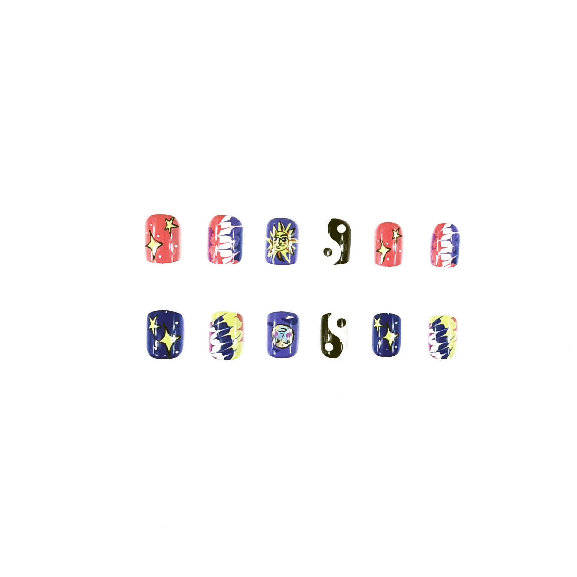 Celestial Dreams Short Oval Colorful Nail Set with Star and Yin Yang Designs