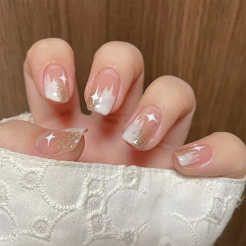 Celestial Elegance Medium Square Pink and White Glitter Ombre Press On Nail Set with Star Accents