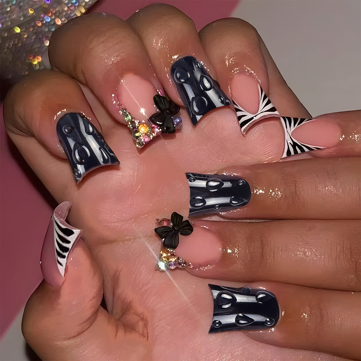 Charming Elegance Long Duck Navy and Pink Nails with Unique Bow and Gem Accents