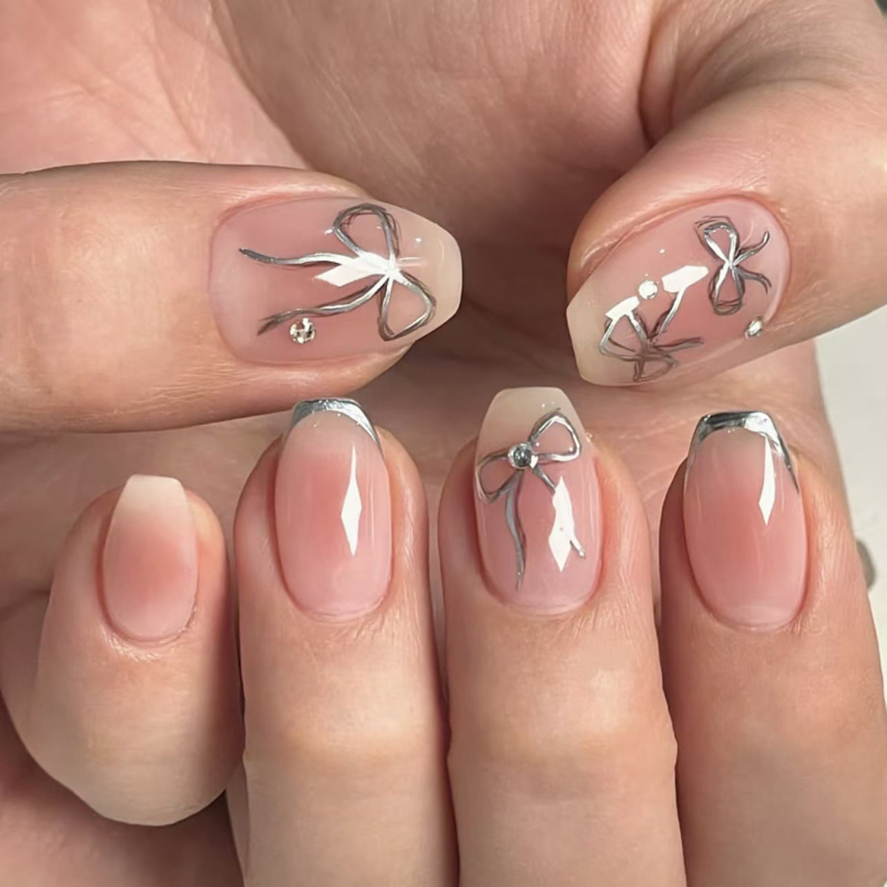 Charming Elegance Short Coffin Soft Pink with Dazzling Silver Bow Accents Nail Set