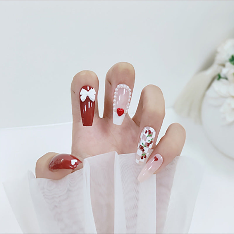 Charming Romance Long Coffin Red and Pink Press On Nail Set with Bow and Cherry Design
