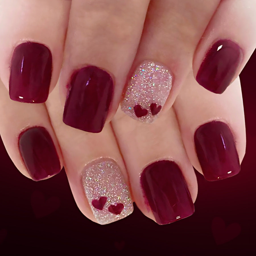 Charming Romance Short Square Burgundy Glitter Heart Press On Nail Set
