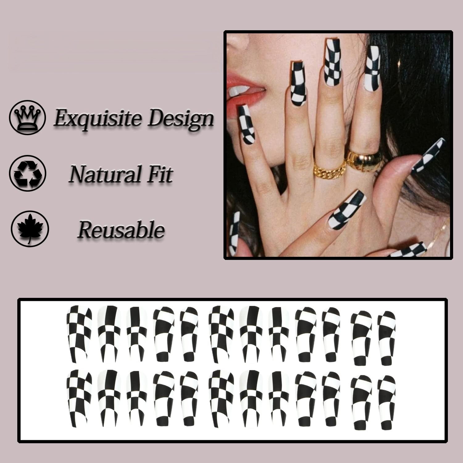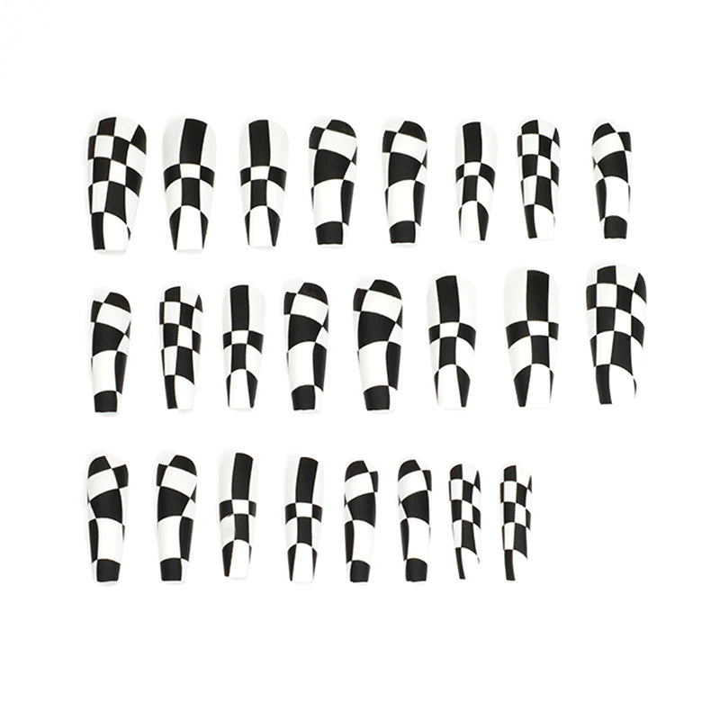 Checkered Wavy Long Square Black Groovy Press On Nails