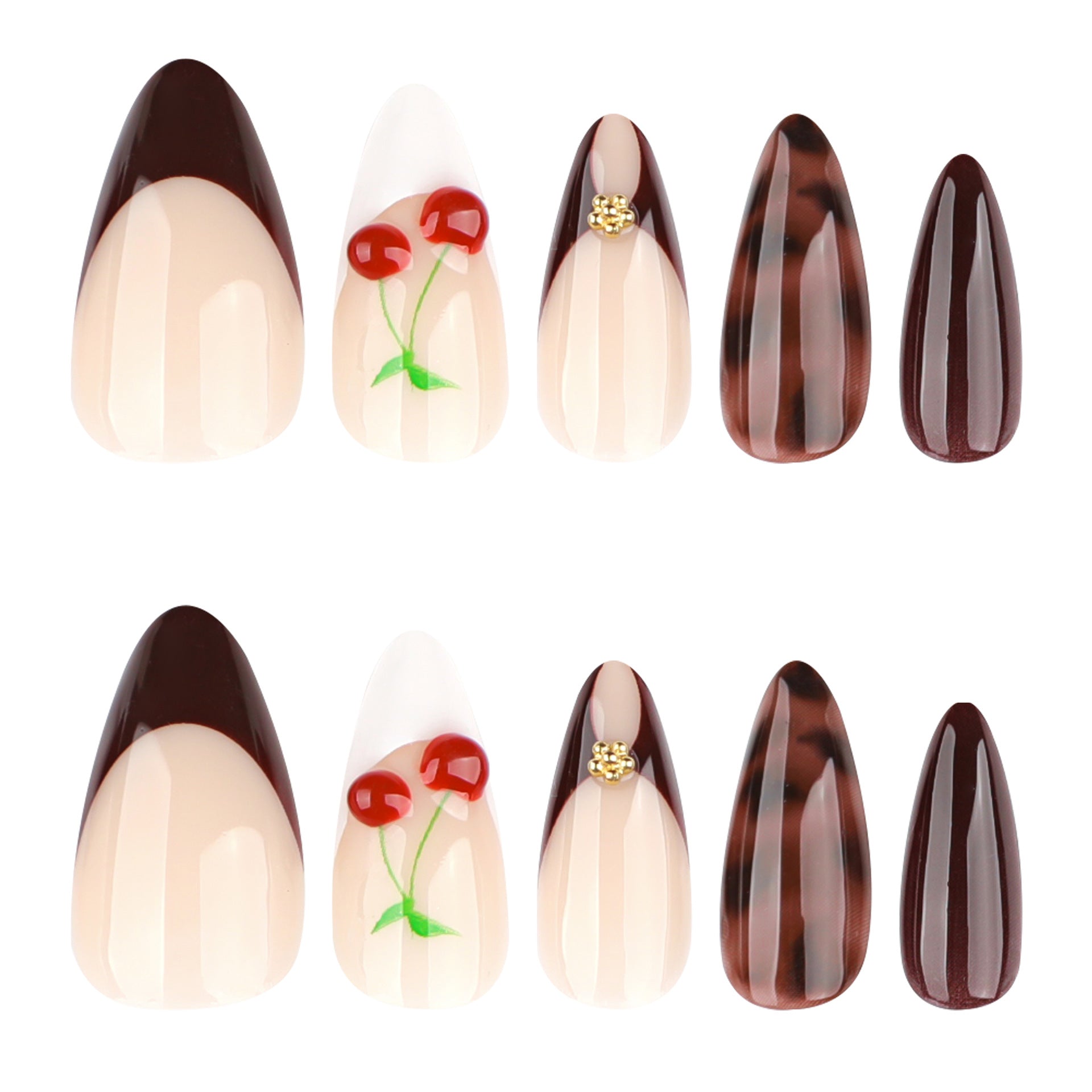 Cherry Blossom Elegance Medium Almond Shape Brown and Beige Tones with Floral Accents and Glossy Finish Press On Nail Set