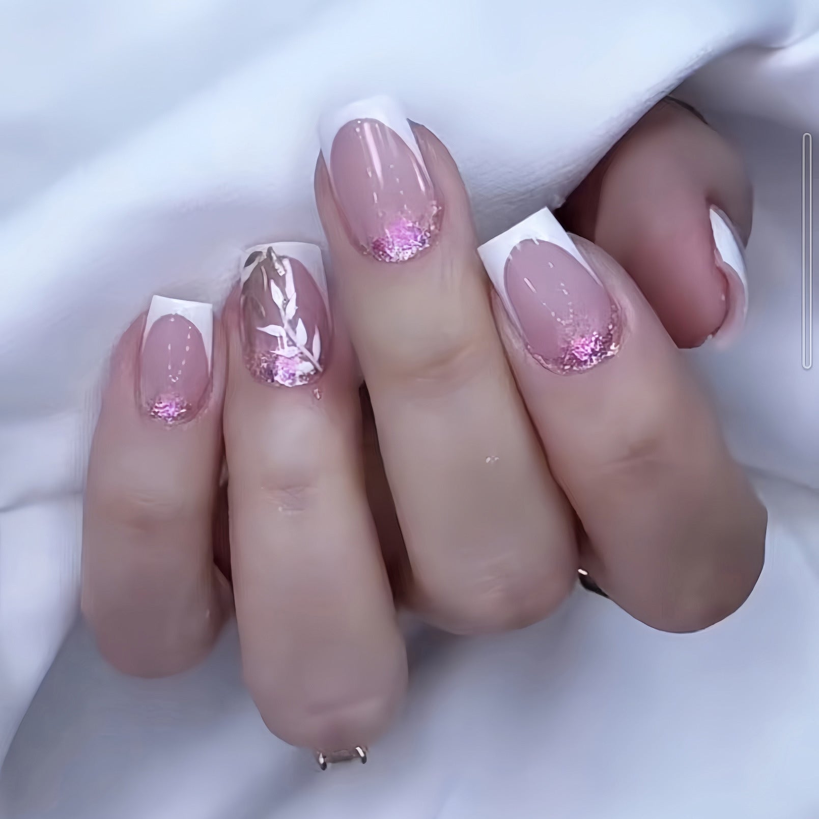 Chic Blossom Medium Square Pink and White Press On Nail Set with Glitter Accents and Floral Design