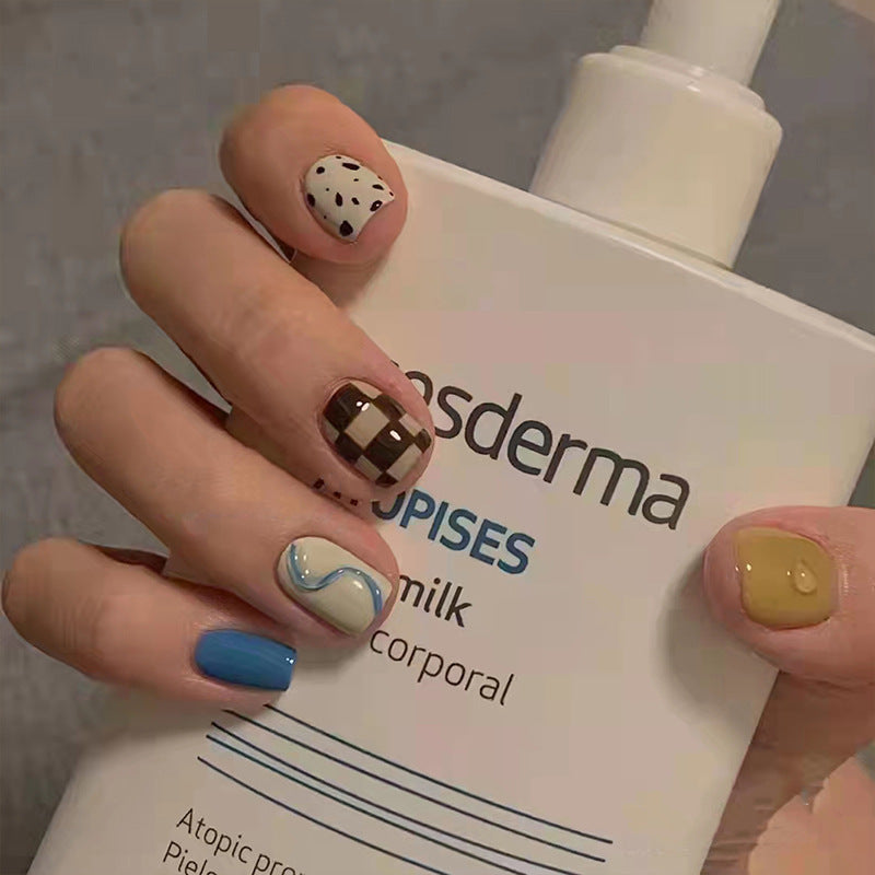 Chic Cafe Latte Collection Short Round Shape Multicolor Press On Nail Set with Unique Pattern Accents