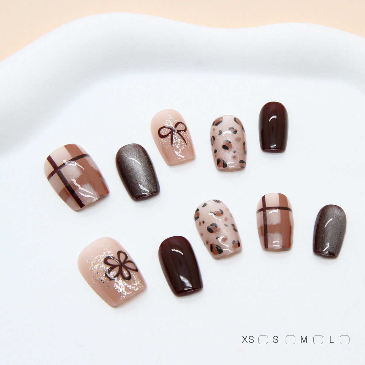 Chic Elegance Short Square Brown and Beige Press on Nail Set with Unique Bow and Glitter Design