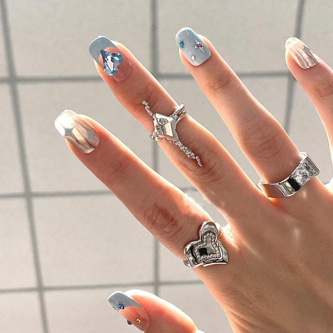 Chic Mermaid Inspired Long Square Light Blue Glitter Press On Nail Set with Iridescent Shine