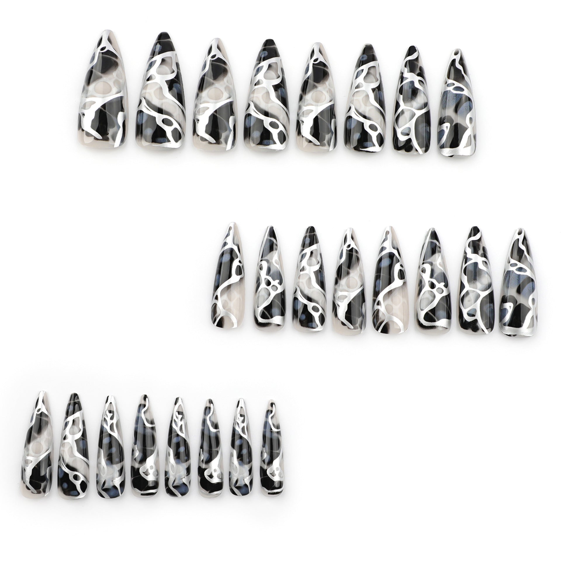 Chic Monochrome Long Almond Press On Nails with Unique Artistic Swirl Design