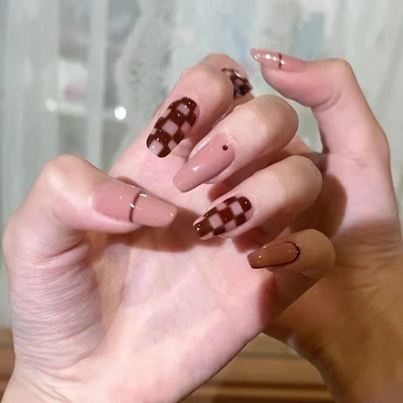 Chocolate Dream Long Coffin Brown Gradient Checkered Pattern Press On Nail Set