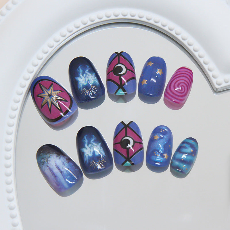 Cosmic Dreamland Press On Nail Set in Short Round Shape with Deep Blue and Vibrant Pink Featuring Stunning Celestial Designs