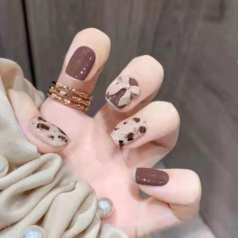 Cozy Cocoa Short Square Press on Nail Set in Mocha with Glitter Accents and Bow Design