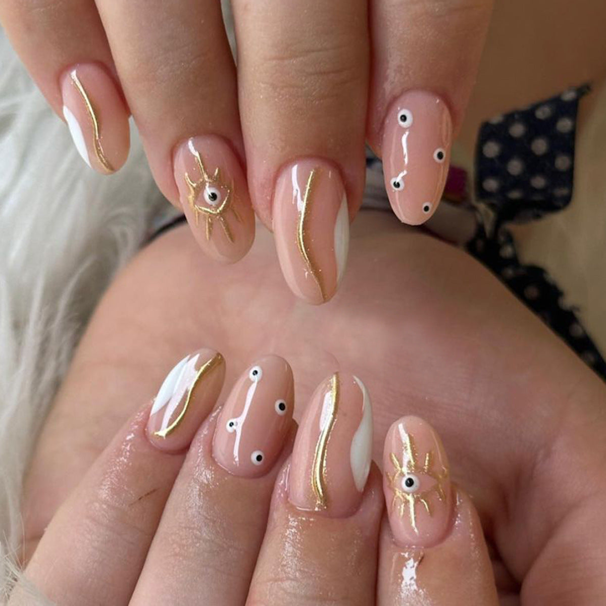 White Swirl Lines Medium Coffin White Everyday Press On Nails