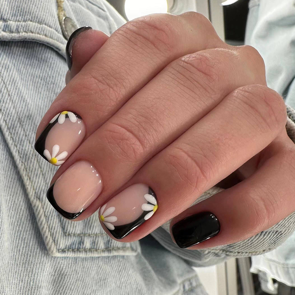 Daisy Dreams Square Press On Nail Set Short Black and Beige Floral Design with Unique Matte Finish